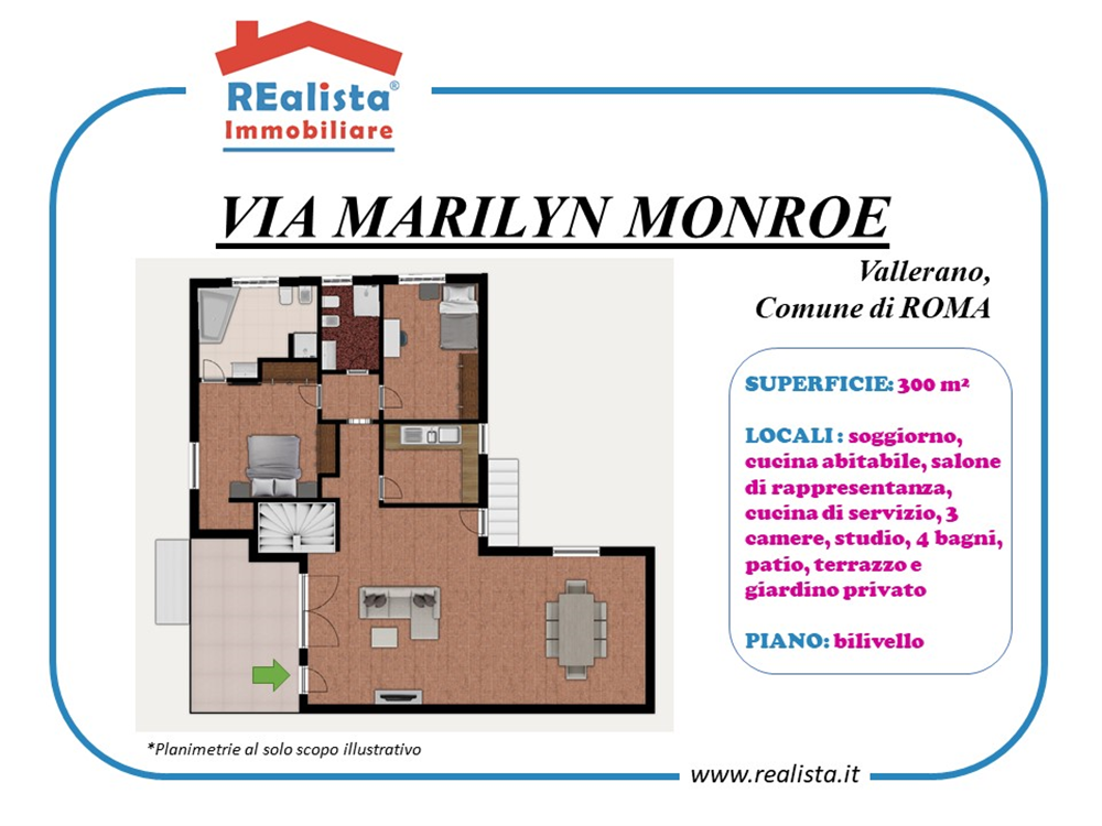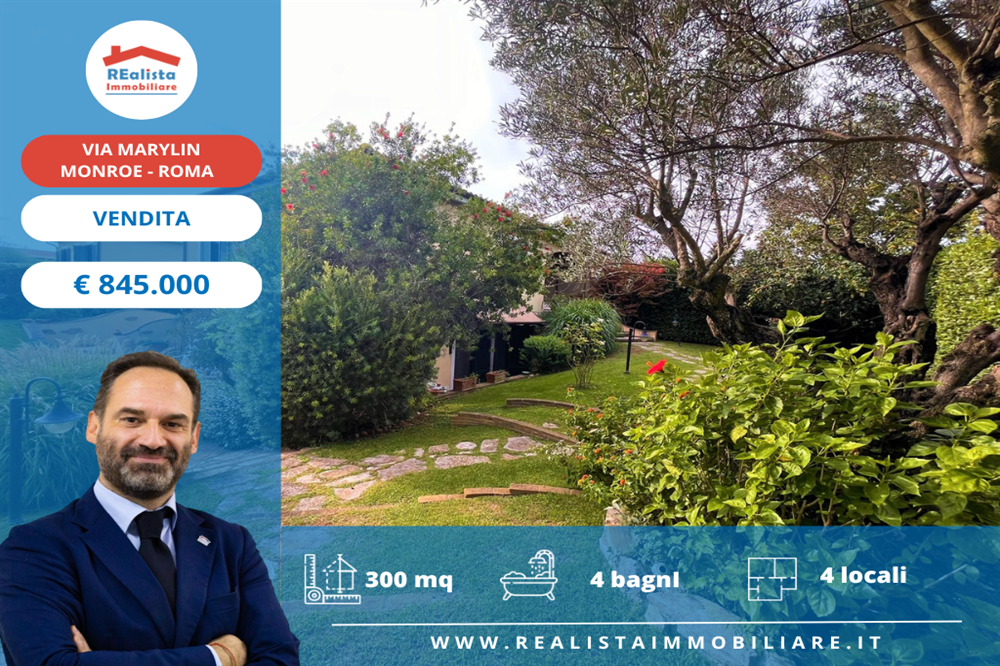 n zona Valleranello, più precisamente in via Marilyn Monroe, Realista Group è lieta di presentare in vendita una villa di ampia metratura che si sviluppa su due livelli e con pluri-ingressi pedonali e carrabile, e gode di una posizione invidiabile trovandosi all'interno di un prestigioso complesso residenziale immerso nel verde, elegante e riservato, dotato di campi da tennis, calcetto e piste ciclabili, parco ed area pic-nic. Al piano terra dotato di portoncino di ingresso indipendente, troviamo un grande soggiorno con una ampia cucina abitabile con dispensa, uno studio con bagno en-suite, una camera da letto con bagno en-suite, ripostiglio, guardaroba e disimpegno con la scala interna che conduce al livello superiore. Al primo piano dotato anch’esso di un secondo ingresso indipendente da cui si accede attraverso un comodo portico, si trovano un ampio e luminoso salone di rappresentanza, cucina separata, due camere da letto di cui una con bagno en-suite, ed un altro bagno. La villa, in perfetto stato di manutenzione, vanta finiture in legno e marmi di pregio, impianto di aria condizionata a pompe di calore, sistema di allarme, grate di sicurezza e zanzariere alle finestre. All'esterno, un curatissimo giardino privato angolare su più livelli con diverse piantumazioni preziose e tutte dotate di impianto di irrigazione autonomo , piscina jacuzzi e doccia esterna circonda l'abitazione. Completano la proprietà un grande patio coperto amovibile di circa 80 mq con deposito sdrai, tavoli, biciclette, barbecue, dotato di allaccio autonomo di gas metano e acqua potabile. La posizione strategica dell’immobile è ideale per chi cerca comodità ed una vita all'aperto in ambiente curato e riservato. La villa e’ in perfetto stato manutentivo e dotata di tutte le certificazioni impiantistiche. All’interno del residence e’ possibile parcheggiare auto proprie e per ospiti. L’immobile si trova infatti tra via Pontina e via Laurentina, a breve distanza dal Grande Raccordo Anulare, così come da altri punti nevralgici della zona, tra cui l’Università ed ospedale Campus Bio-Medico di Roma e il centro commerciale Maximo. Nelle immediate vicinanze si trovano scuole, negozi di vario genere, bar, ristoranti, Non perdete questa opportunità. Contattateci oggi stesso ai numeri 0651531015 o 3333586136 per ulteriori informazioni e per organizzare una visita. La Realista Group è pronta a guidarvi attraverso il processo di acquisto ed offrirvi un servizio professionale attento a ogni vostra esigenza. *** TUTTE LE INFORMAZIONI, PLANIMETRIE, DESCRIZIONI E CARATTERISTICHE RIPORTATE NEL PRESENTE ANNUNCIO SONO MERAMENTE INDICATIVE E NON COSTITUISCONO IN ALCUN MODO ELEMENTI CONTRATTUALI.***